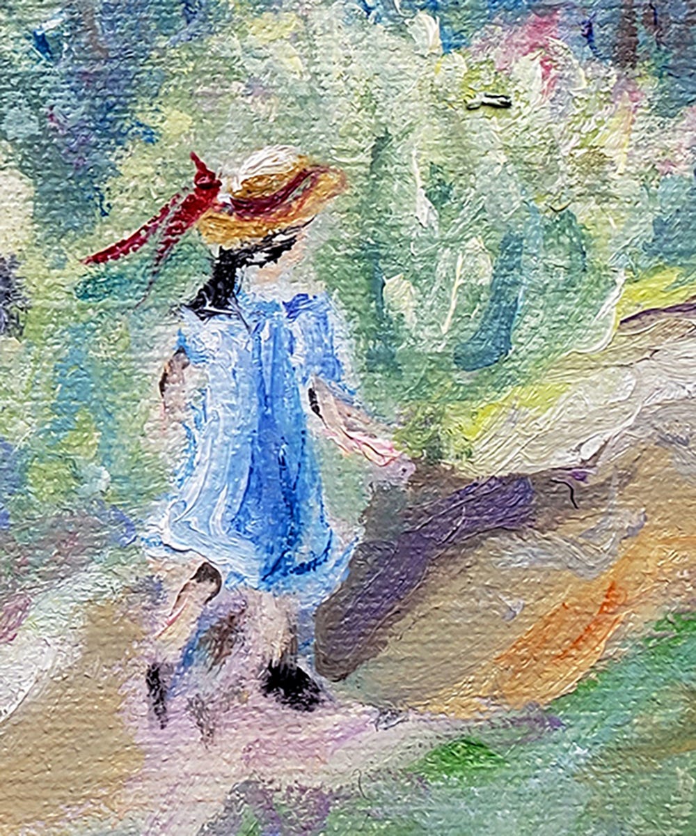 She skips down the path like the clouds that float across the sky, blown by the wind. She seems to have a story of all her own. Where do you think she is going?